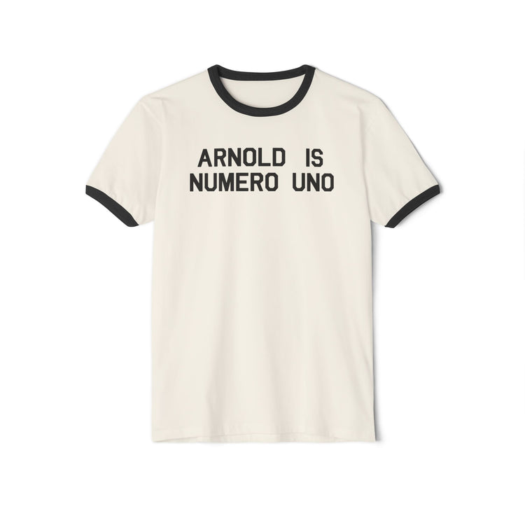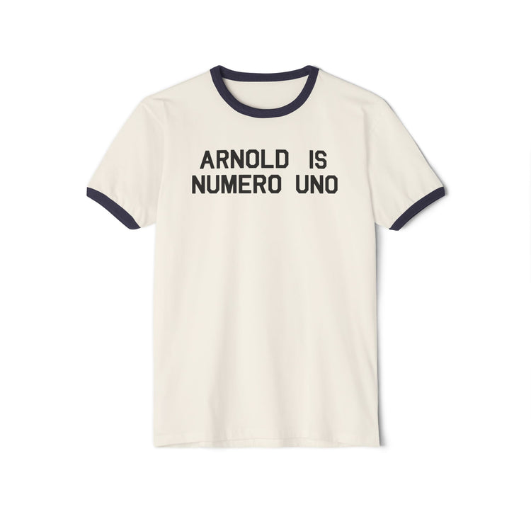 Arnold is Numero Uno! A classic ringer tee recreated from bodybuilding history.